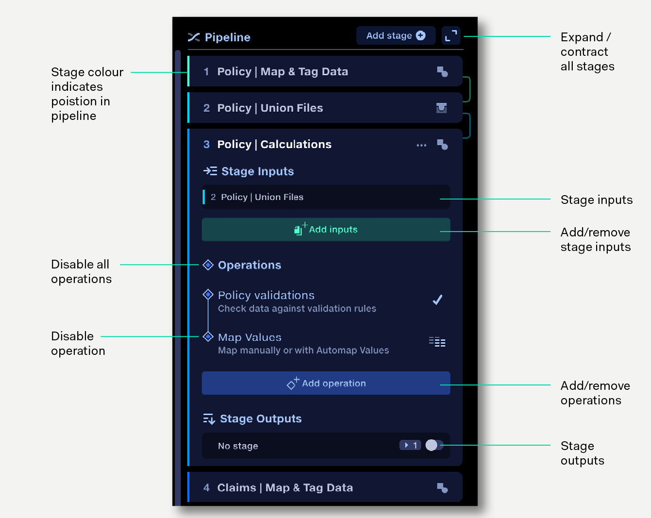 Stages can be visually expanded to show inputs, outputs and configuration options, and can be collapsed to provide an overview of the whole process. When clicked, operations slide across to reveal their configuration panel.