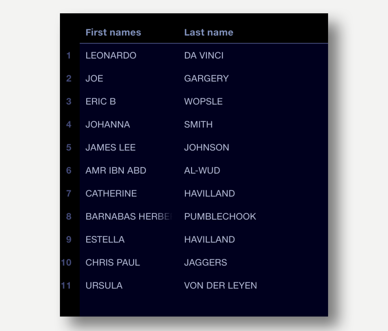 Split into columns for first names and last name. The first names column also includes any middle names submitted. The process could be adapted to split these into a separate column if needed.